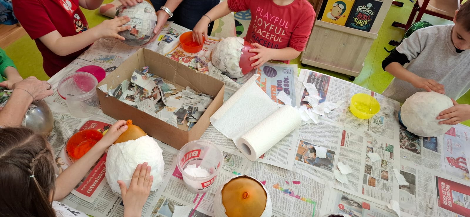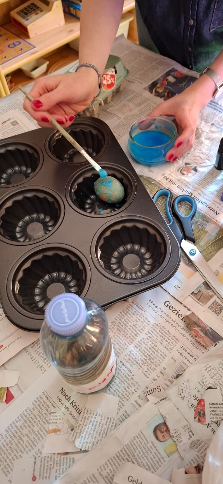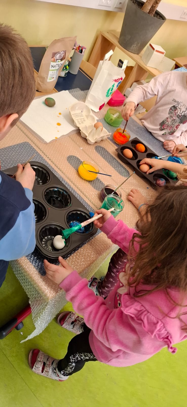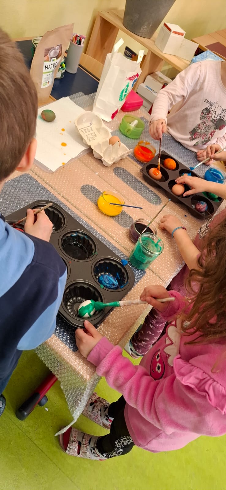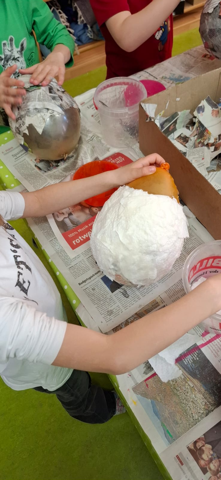 Mit viel Sorgfalt und Geschick gingen die Burschen und Mädchen ans Ostereierfärben heran. Nach Anleitung von Klassenlehrerin Eva Pignieri wurden Natron mit Lebensmittelfarbe vermischt und die Eier damit bestrichen. Anschließend platzierten die Kinder ihre Eier in die Form und schäumten sie zwecks Fixierung der Farbe mit Essig auf. Das Osternest dazu wurde aus Pappmaché gebastelt. Das Ergebnis kann sich sehen lassen – viele farbenprächtige Ostereier, die nun verschenkt werden können!